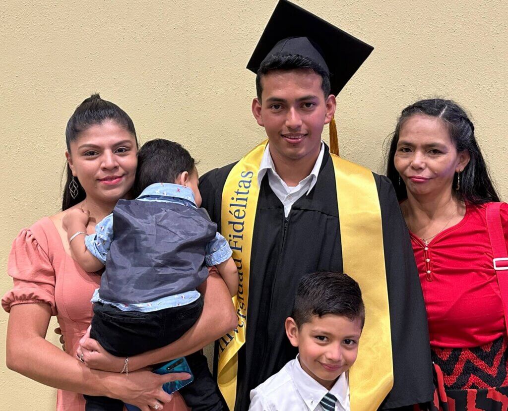 Edwin compartió la alegría de graduarse con su esposa Evanesis, su madre y sus dos hijos pequeños.