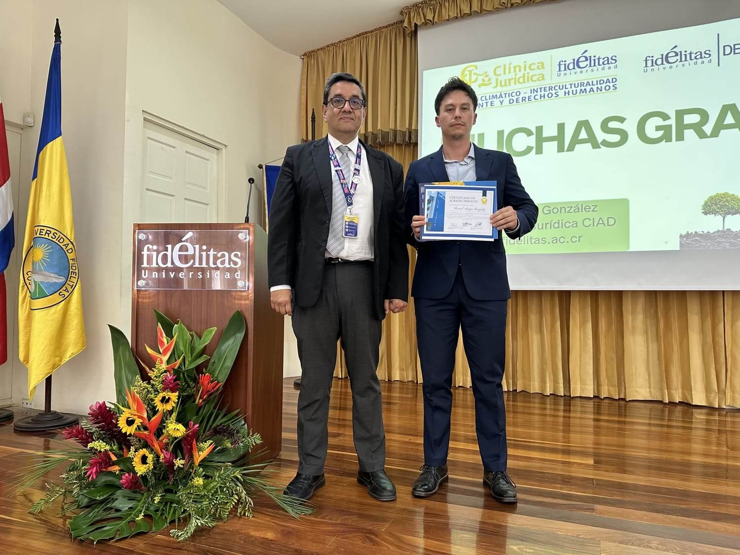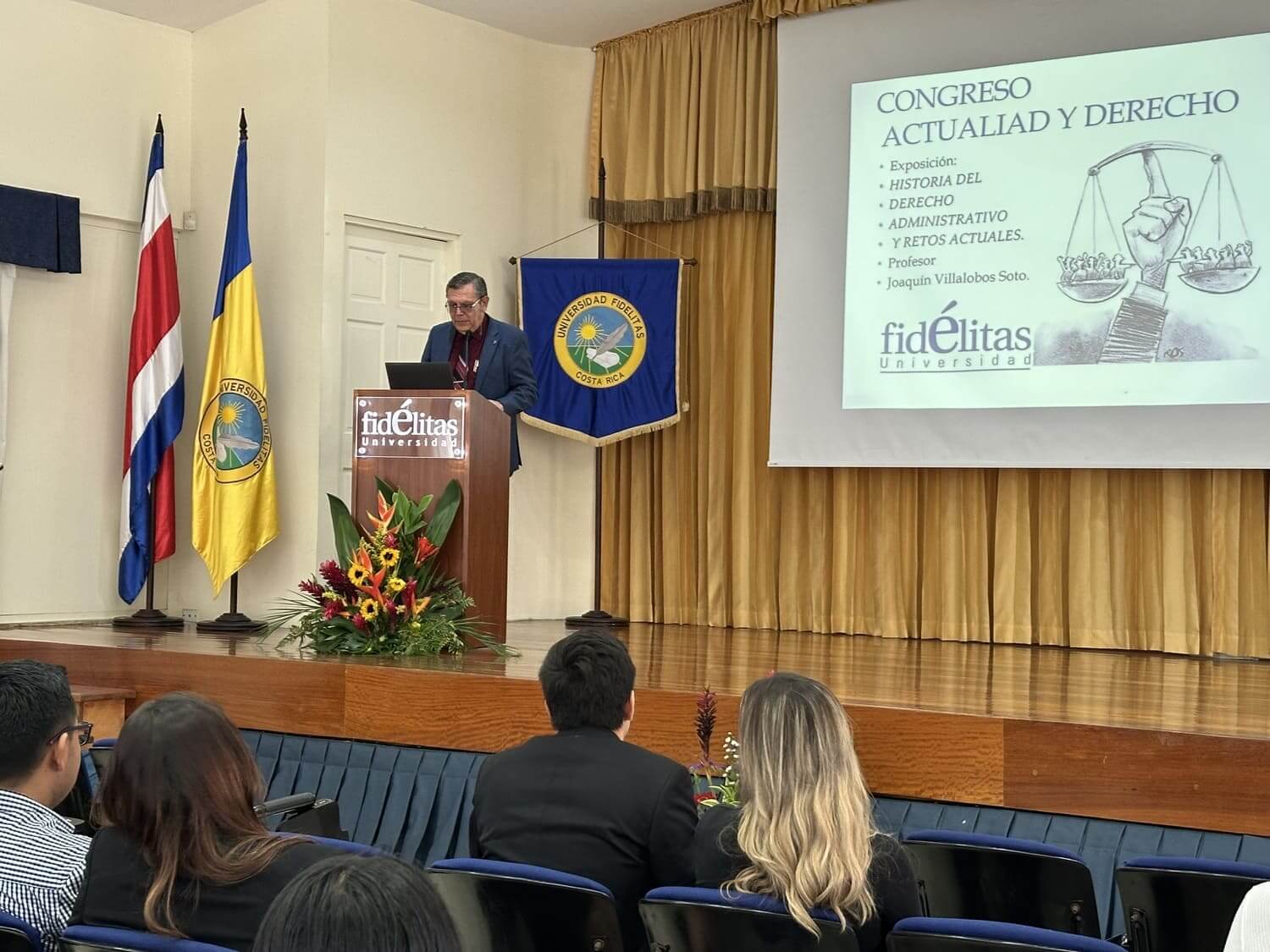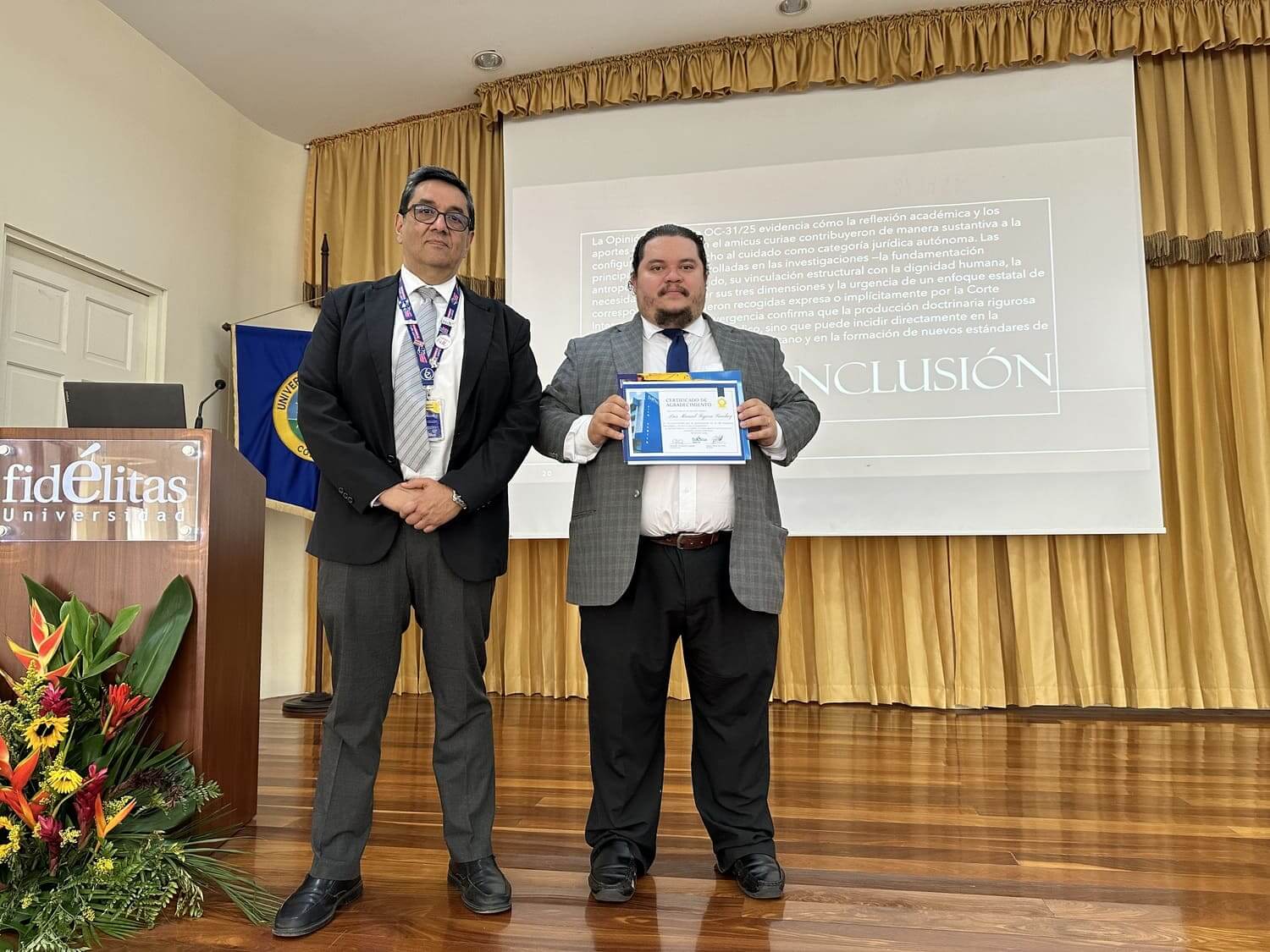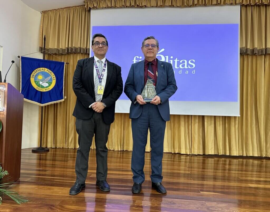 Este congreso fue dedicado a Joaquín Villalobos Soto, especialista en Derecho Administrativo, reconocido por su trayectoria y aporte a la formación jurídica. En la fotografía aparece junto a Marco Fallas, director de la carrera de Derecho.