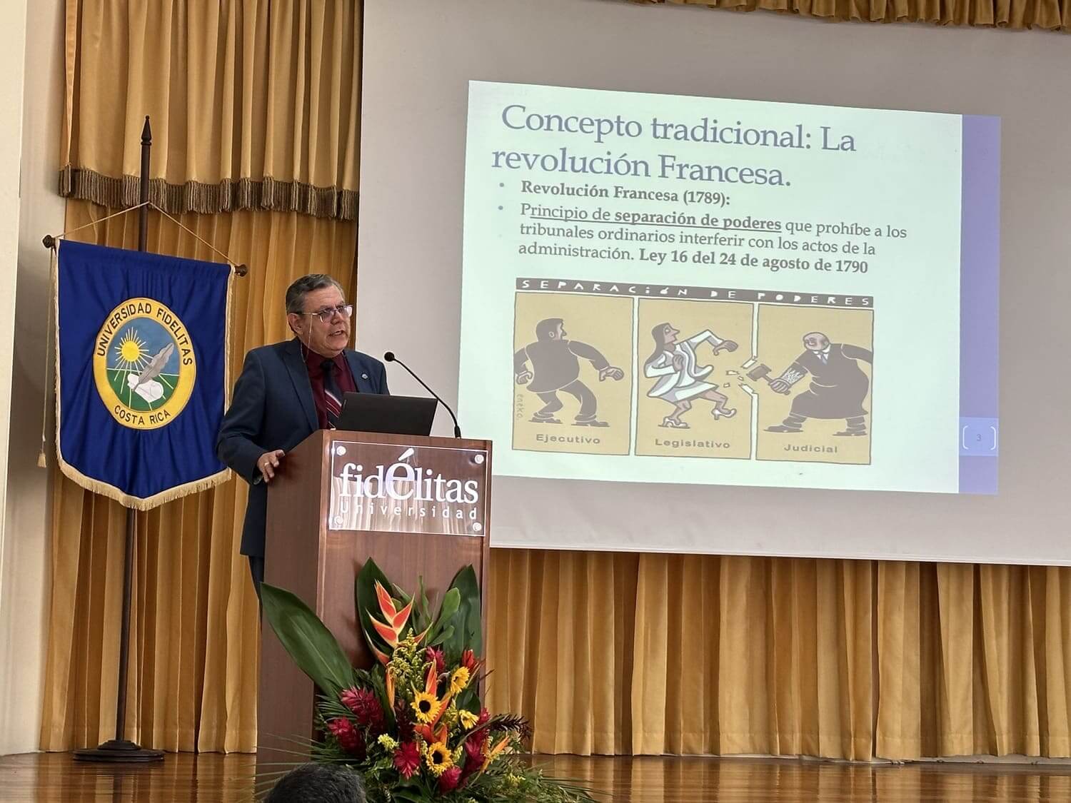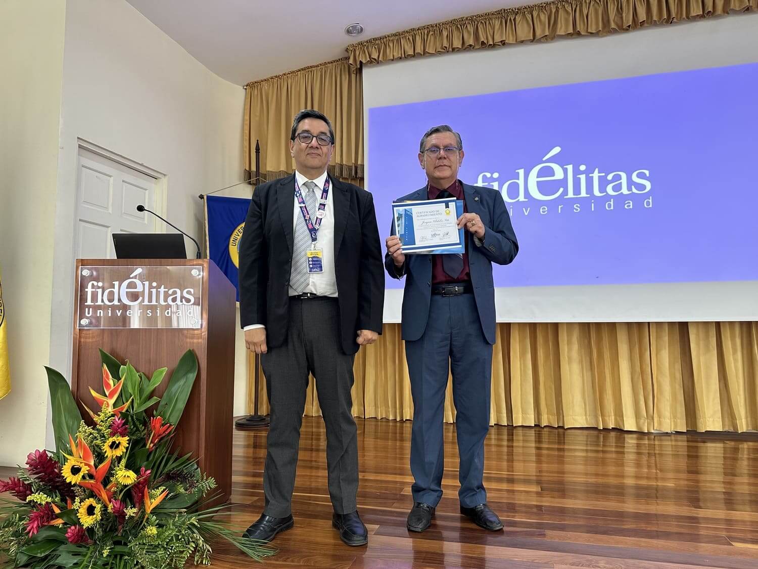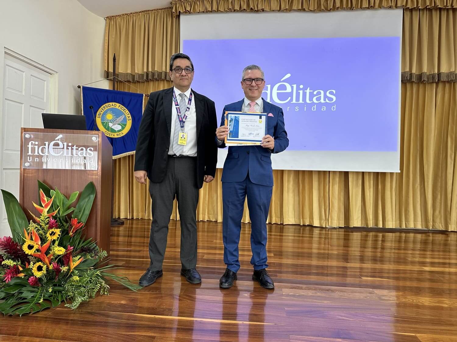 Este congreso fue dedicado a Joaquín Villalobos Soto, especialista en Derecho Administrativo, reconocido por su trayectoria y aporte a la formación jurídica. En la fotografía aparece junto a Marco Fallas, director de la carrera de Derecho.