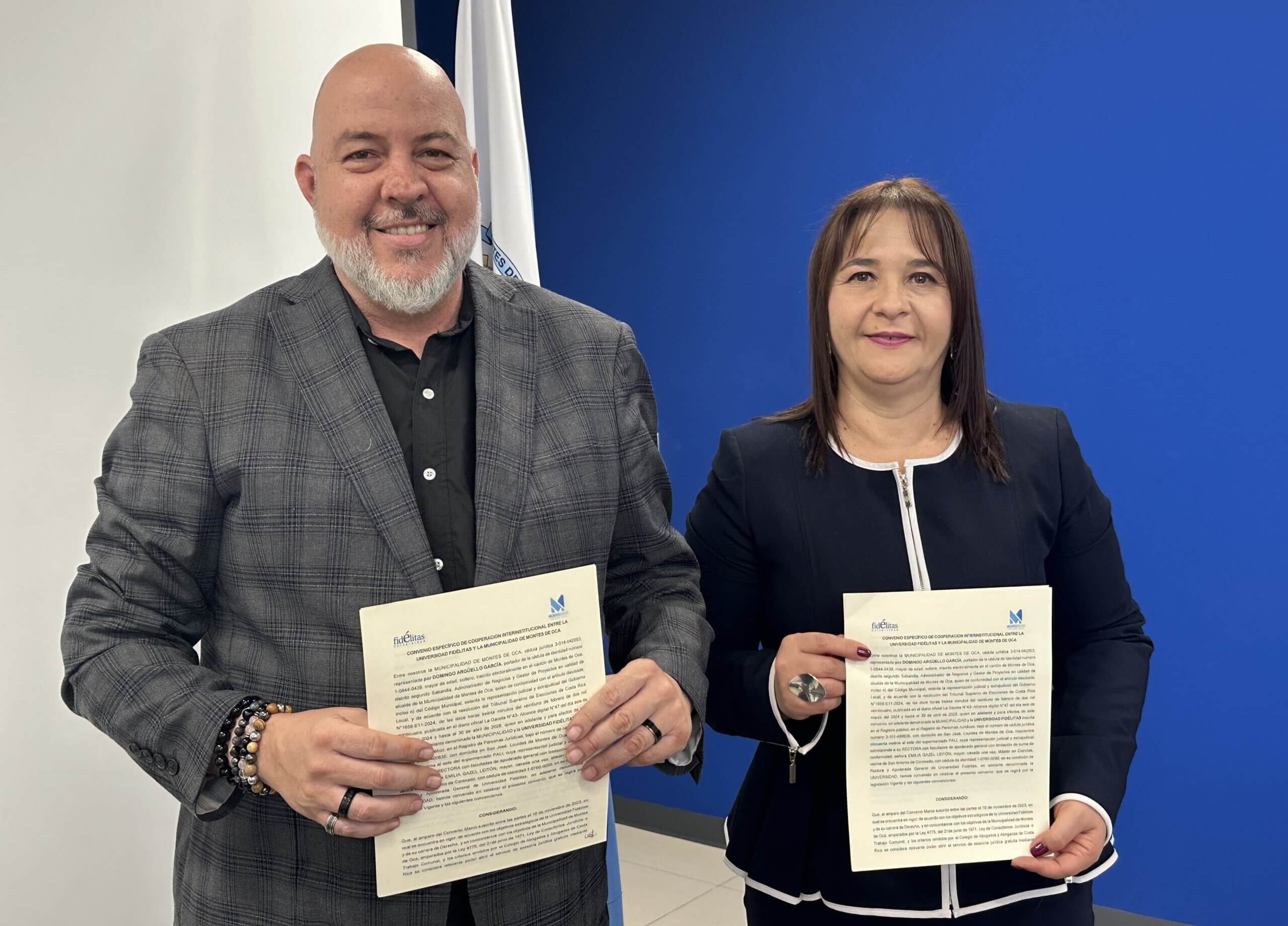 La rectora Emilia Gazel de Fidélitas y el alcalde Domingo Argüello se mostraron complacidos por la firma del convenio. Con esta iniciativa ambas partes ayudarán a los habitantes del cantón y a los estudiantes para que profesionalicen sus conocimientos al atender personas usuarias urgentes de apoyo y asesoría legal.