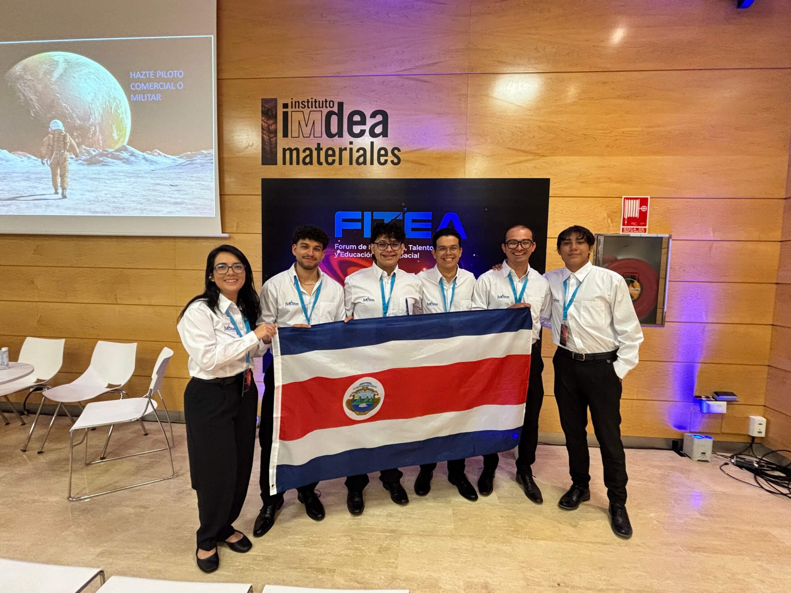 Ghazeel Morales, Yair Navarro, Endry Rosales, Brandon Ugalde, Emanuel Jiménez y Andrea Alfaro son los seis jóvenes que llevaron a Costa Rica al primer lugar, demostrando que el trabajo en equipo y la determinación pueden trascender fronteras. Los acompañan Emilia Gazel, rectora de U Fidélitas, y Marcos Alvarado, decano de Ciencias Sociales y Económicas, quienes celebraron este logro como un orgullo para la comunidad universitaria.
